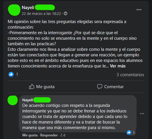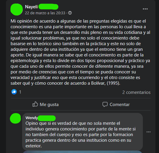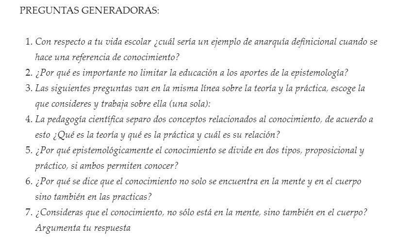 Después de realizar el esquema y junto con la lectura de «Epistemología y discurso pedagógico» de forma individual se realizaron tres preguntas esenciales que se tuvieron que subir a un documento para darlas a conocer a los compañeros y luego poder escoger tres preguntas favoritas para participar en un foro virtual de opinión partiendo de las preguntas generadoras.