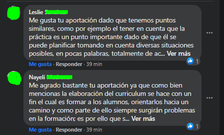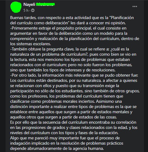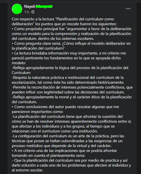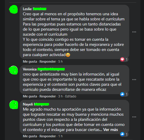 Al igual que las otras actividades de este estilo me pareció muy buena forma de aprendizaje ya que nos permite conocer las diferentes opiniones de nuestros compañeros e interactuar de manera distinta, y en cuanto a la lectura me gusto bastante ya que nos brinda una idea más amplia sobre el curriculum y en que es lo que debe estar enfocado y los puntos que se deben tener en cuenta a la hora de su planificación para darle respuesta a tal objetivo o problemática que se presente. En general esta actividad me dejo un gran aprendizaje y la forma de trabajar se me hace muy atractiva y buena.